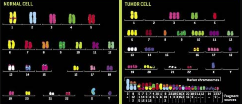 암세포의 염색체를 보면 깨져있고 없어져있고 똑같은 게 여러 개 발견되고 아주 난리가 나있다.