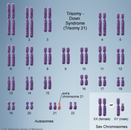 또 다운 신드롬에 걸린 사람은 저렇게 21번 염색체가 2개가 아니라 3개가 발견됨.
