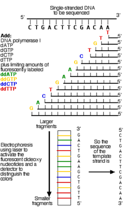 프레더릭은 이 서열을 알아내기 위해서 각각의 뉴클레오티드 (A, T, G, C)에 서로 다른 색을 붙인다.